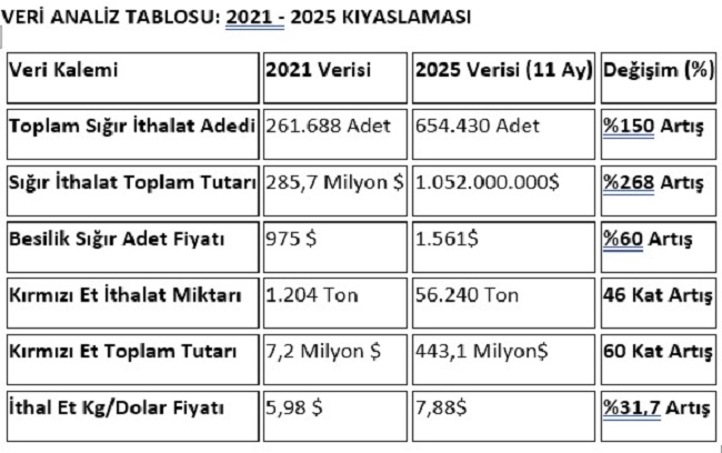 İthalatın sadece fiyatı değil, miktar olarak da arttığını belirten CHP Niğde Milletvekili Ömer Fethi Gürer, 2021 yılında toplam 261.688 adet sığır ithal edilirken, 2025’in ilk 11 ayında bu sayı 654.430 adede ulaştı. Artış oranı yaklaşık %150. 2021’de sığır ithalatına 285,7 milyon dolar ödenirken, 2025’in ilk 11 ayında bu rakam 1 milyar 52 milyon dolara (1,05 Milyar $) çıktı. Toplam tutardaki artış %268 olarak hesaplandı.” Dedi.
