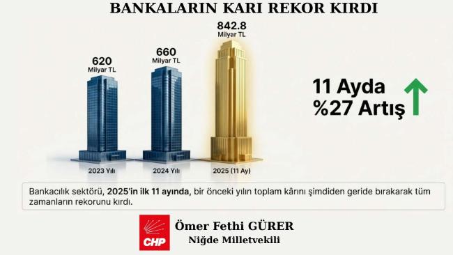 CHP Milletvekili Ömer Fethi Gürer, “Verilere göre bankacılık sektörü, 2023 yılını 620 milyar TL, 2024 yılını ise 660 milyar TL net kârla kapatmıştı. Ancak 2025 yılının henüz ilk 11 ayında bu rakam 842 milyar 845 milyon TL’ye ulaşarak tüm zamanların aştı. Bankalar, vatandaşın borç yükü altında ezildiği bir dönemde kârlarını bir önceki yılın tamamına göre şimdiden %27 oranında artırmayı başardı,” dedi.