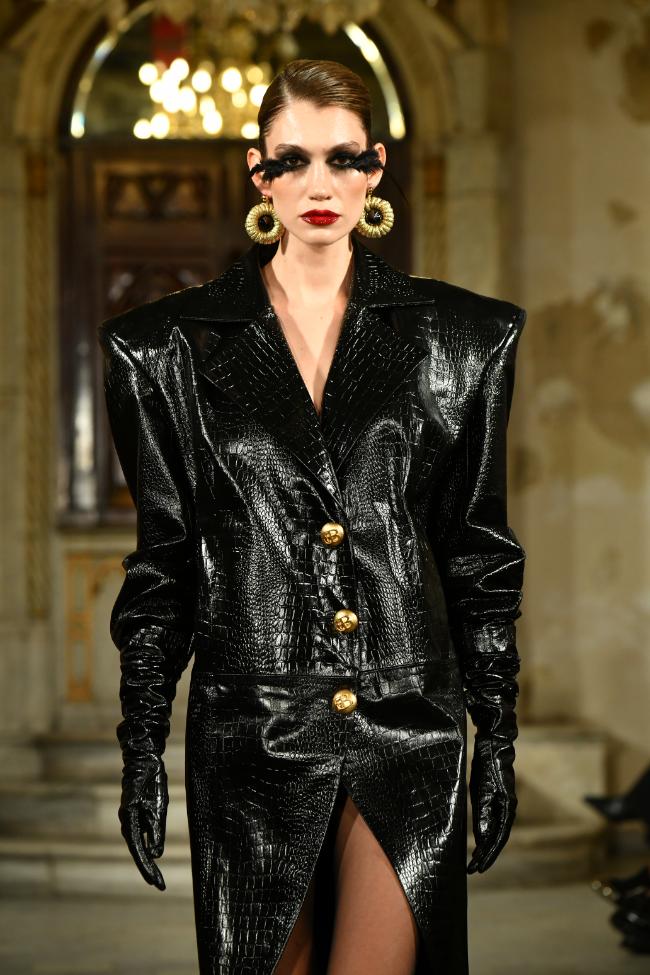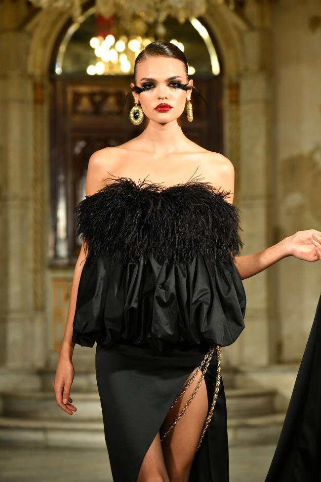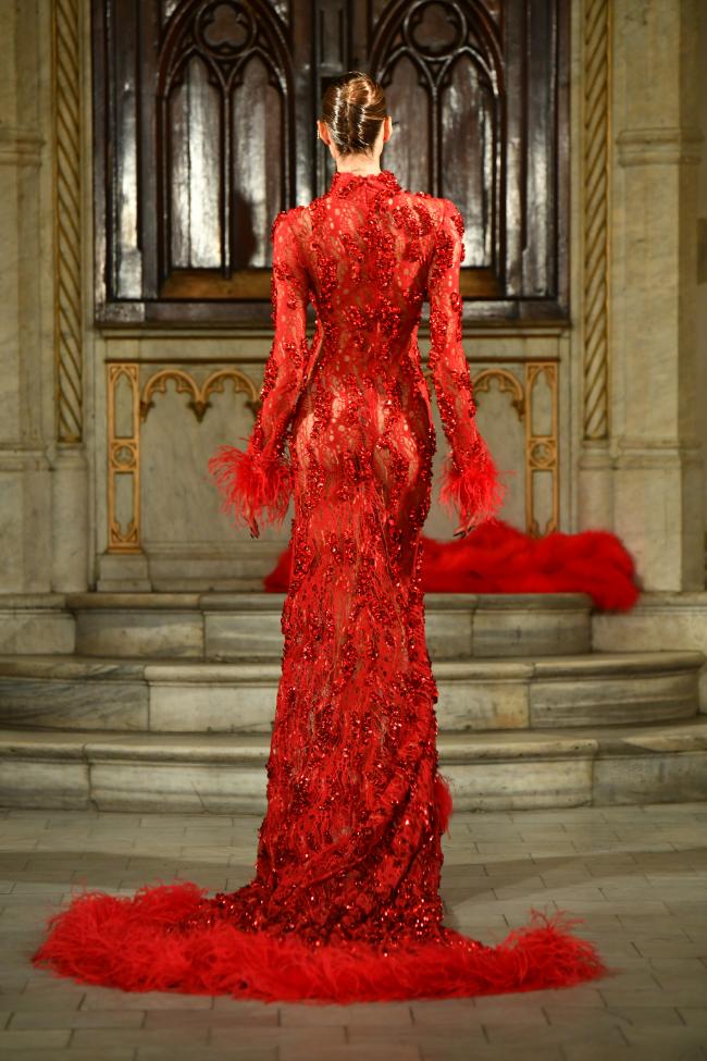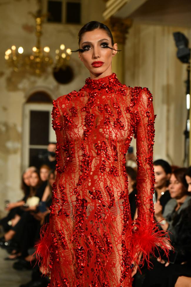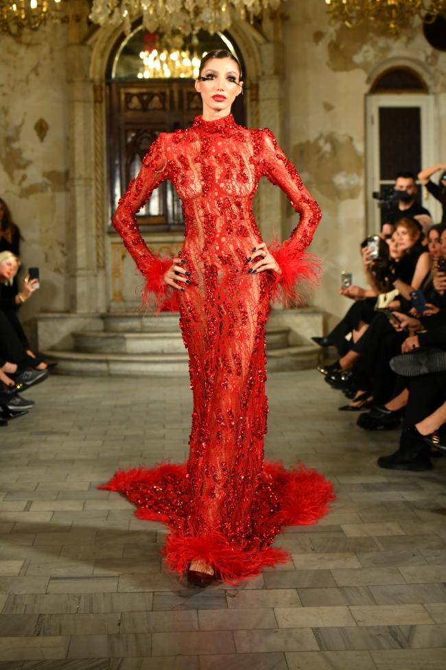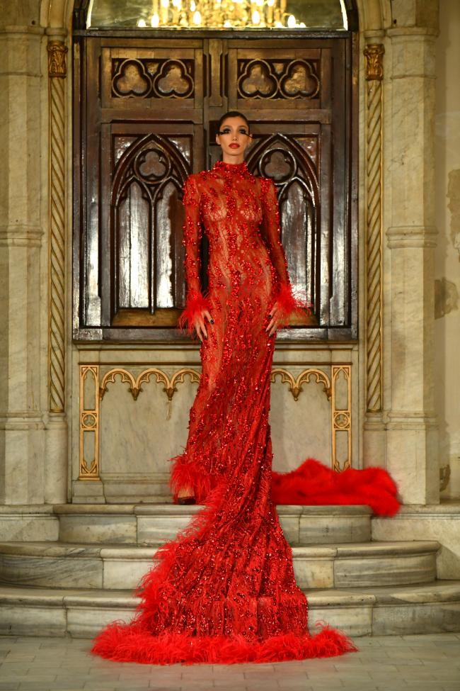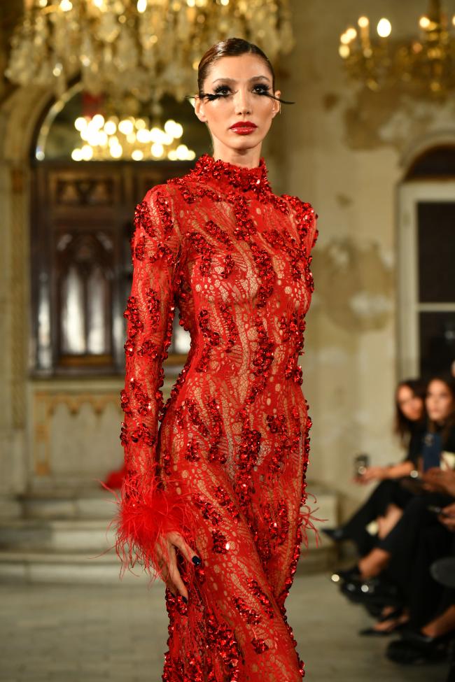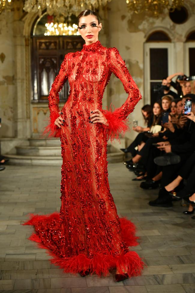 “La Nuit Rouge” koleksiyonu, kadının gücünü, zarafetini ve ulaşılmaz cazibesini yansıtıyor. Siyah dantel, kadife ve altın detayların öne çıktığı parçalar, dramatik siluetleriyle dikkat çekiyor. Koleksiyonun finalinde yer alan kırmızı kabarık etekli couture look, defilenin doruk noktası oldu.
