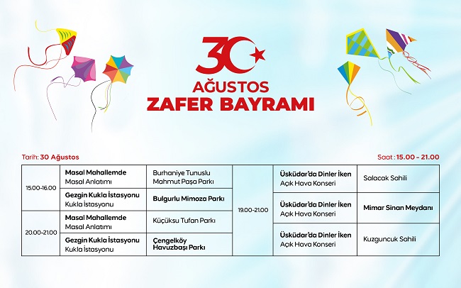 Zafer Bayramı kutlamaları yalnızca İskele Meydanı’yla sınırlı kalmayacak. Üsküdar’ın farklı noktalarında da bayram coşkusu hissedilecek. Saat 15.00 ile 16.00 arasında Burhaniye Tunuslu Mahmut Paşa Parkı, Bulgurlu Mimoza Parkı, Küçüksu Tufan Parkı ve Çengelköy Havuzbaşı Parkı’nda çocuklar için masal anlatımları ve kukla gösterileri düzenlenecek. Aynı etkinlikler saat 20.00-21.00 saatleri arasında yeniden sahnelenecek.
