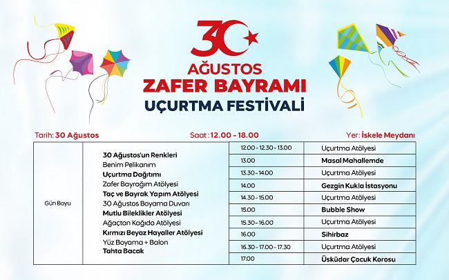 Bayram kutlamalarının merkezinde Uçurtma Festivali yer alıyor. 30 Ağustos cumartesi günü saat 12.00 ile 18.00 arasında Üsküdar İskele Meydanı’nda gerçekleşecek festivalde, çocuklara ücretsiz özel uçurtma dağıtımı yapılacak. Gün boyu düzenlenecek uçurtma atölyeleri, Zafer Bayrağım Atölyesi, taç ve bayrak yapım atölyesi, mutlu bileklikler atölyesi ve kırmızı beyaz hayaller atölyesi ile küçükler hem eğlenecek hem de üretmenin keyfini yaşayacak. Ayrıca yüz boyama, balon etkinlikleri ve tahta bacak gösterileri de festivale renk katacak.