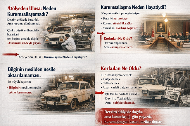 Bu ruh, 1961 yılında iki otomobili yapabilmek için 24 saat esasına göre, ailelerinden, uykularından, kişisel hayatlarından vazgeçerek çalışan mühendislerin somut emeğinde vücut bulmuştur. O gün ortaya konulan şey yalnızca teknik bir üretim değil; büyük bir idealin ve inancın ete kemiğe bürünmüş hâlidir.